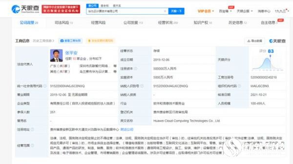 华为云计算技术有限公司成立于2019年12月,法定代表人为张平安,经营范围包括增值电信服务;出版物零售;互联网文化活动;互联网平台、零售、安全、数据服务等。股东信息显示,该公司由华为技术有限公司全资持股。