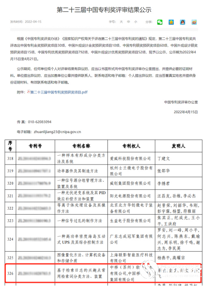 在2022年4月26日,第22个世界知识产权日来临之际,国家知识产权局公布了第二十三届中国专利奖获奖名单,中国移动云能力中心凭借发明专利《基于检索日志的兴趣点常用检索词分类方法、装置》荣获中国专利优秀奖。据悉,中国专利奖由国家知识产权局和世界知识产权组织共同主办,是我国唯一专门对授予专利权的发明创造给予奖励的政府部门奖。