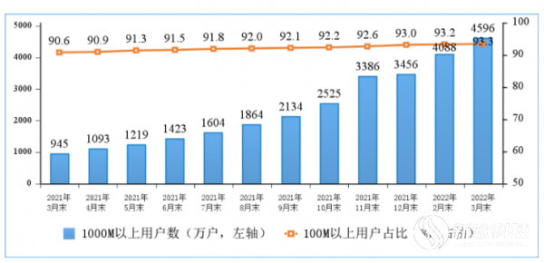 固定宽带接入用户规模稳步增长,千兆用户数持续扩大。截至3月末,三家基础电信企业的固定互联网宽带接入用户总数达5.51亿户,比上年末净增1513万户。其中,100Mbps及以上接入速率的固定互联网宽带接入用户达5.14亿户,占总用户数的93.3%,占比较上年末提升0.3个百分点;1000Mbps及以上接入速率的固定互联网宽带接入用户达4596万户,比上年末净增1140万户。