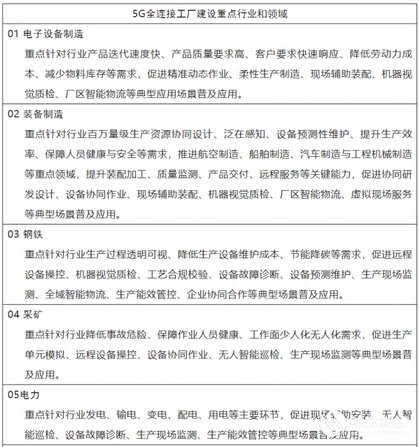 (二)加快重点行业推广。在电子设备制造、装备制造、钢铁、采矿、电力等重点行业和领域,推动发展基础较好、需求较明确的企业主体,率先建设5G全连接工厂,形成数字化、网络化、智能化转型升级标杆;同时,鼓励更多行业企业积极探索5G在工业生产各环节创新应用,实现提质、降本、增效、绿色、安全发展。