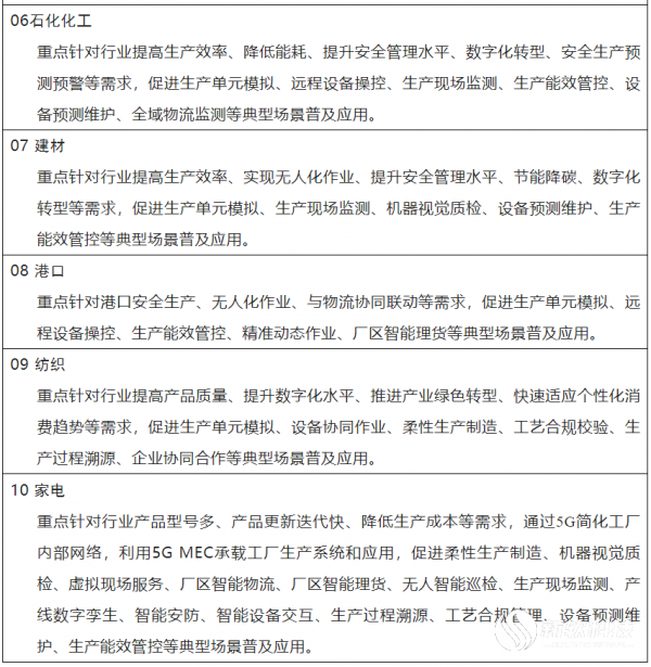 “十四五”时期,主要面向原材料、装备、消费品、电子等制造业各行业以及采矿、港口、电力等重点行业领域,推动万家企业开展5G全连接工厂建设,建成1000个分类分级、特色鲜明的工厂,打造100个标杆工厂,推动5G融合应用纵深发展。