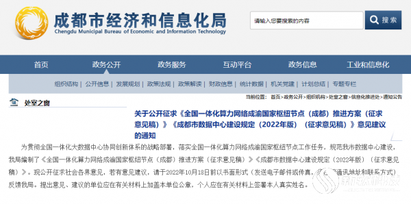 成都市经济和信息化局编制了《全国一体化算力网络成渝国家枢纽节点(成都)推进方案(征求意见稿)》与《成