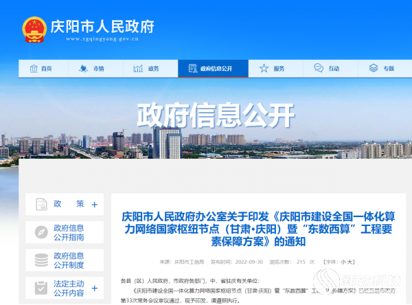 日前,庆阳市印发《庆阳市建设全国一体化算力网络国家枢纽节点(甘肃·庆阳)暨“东数西算”工程要素保障方案》(以下简称“方案”),为加快“东数西算”庆阳节点和数据中心集群建设,提出土地、用水、金融服务等多要素保障措施。
