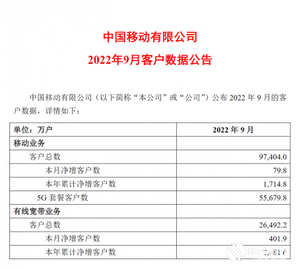截至2022年9月,中国移动移动业务客户总数为9.7404亿户,9月净增客户79.8万户,2022年累计净增客户1714.8万户。其中,5G套餐客户数达到5.56798亿户。