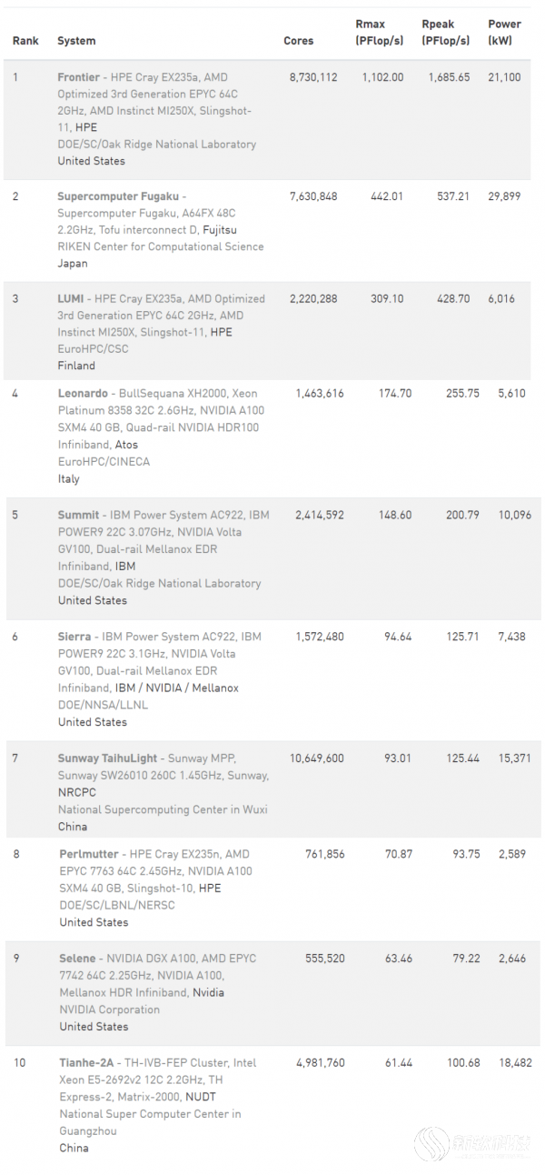 这一速度是榜单上排名第 2 位计算机的近 3 倍。这与今年 6 月份发布的 FLOPS 数据相差不大。