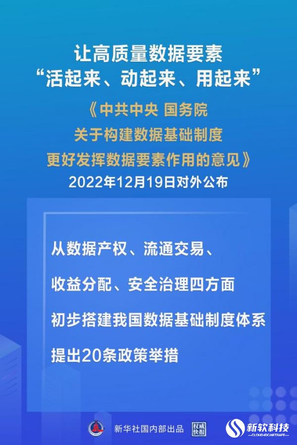 《中共中央国务院关于构建数据基础制度更好发挥数据要素作用的意见》2022年12月19日对外公布。《意见》从数据产权、流通交易、收益分配、安全治理四方面,初步搭建我国数据基础制度体系,提出20条政策举措。