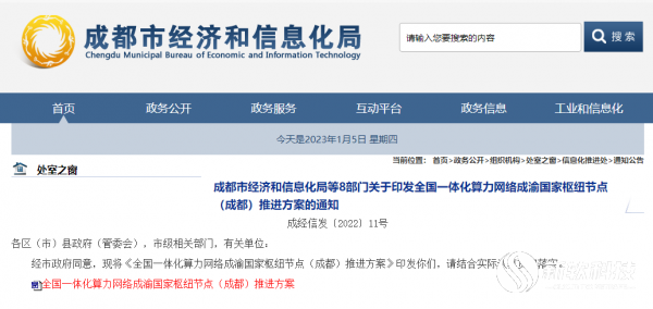 《全国一体化算力网络成渝国家枢纽节点(成都)推进方案》(以下简称“方案”)由成都市经信局等8部门联合印发。