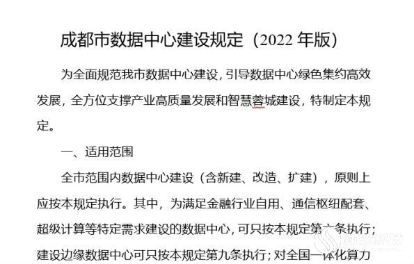 据悉,《规定》适用于成都全市数据中心(含新建、改造、扩建),但金融行业自用、超算等特定需求建设的数据中心可只按绿色指标部分的规定执行,对成渝枢纽节点有重要作用的数据中心采取“一事一议”方式研究确定。