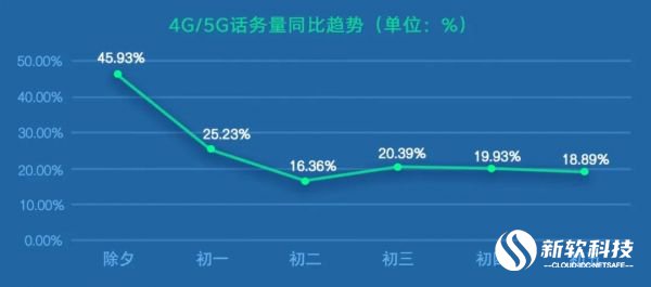 从话务量数据维度看,全国4G/5G日均话务量同比提升24%左右。除夕当天话务量达到春节期间最高值,同比提升超过45%。
