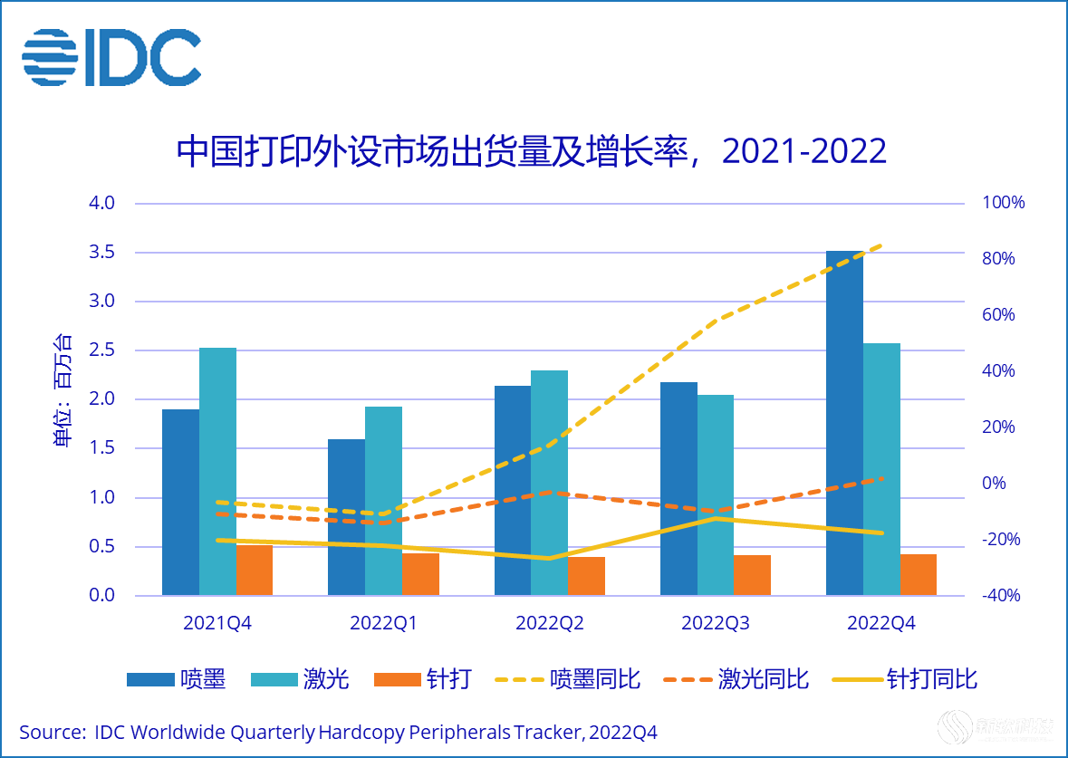 北京,2023年2月24日——IDC最新发布的《中国打印外设市场季度跟踪报告(2022年第四季度)》显示,2022年第四季度,中国打印外设市场出货量为651.1万台,同比增长31.7%。其中喷墨打印机出货量351.3万台,同比增长85.1%;激光打印机出货量257.5万台,同比增长1.7%;针式打印机出货量42.2万台,同比下降17.6%。2022年全年中国打印外设市场出货量为1996.1万台,同比增长8.2%。