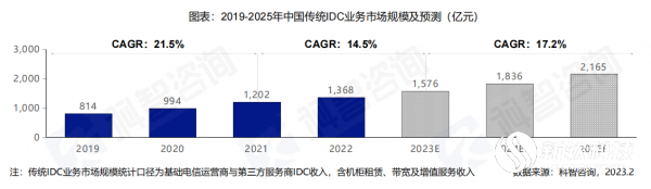 据报告显示,2022年,中国传统IDC业务市场规模达到1368亿元,2021年到2023年复合增长率为14.5%。在未来三年,传统IDC业务市场规模将持续增长,预计到2025年将达到2165亿元,三年复合增长率可达17.2%。