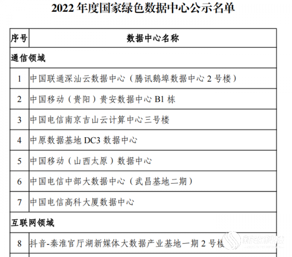 3月21日,工业和信息化部公示了2022年度国家绿色数据中心名单,其中通信领域7个、互联网领域17个、公共机构11个、能源领域1个、金融领域7个,共43家数据中心入选。就通信领域来看,中国电信3个入选,中国移动2个入选,中国联通1个入选,三大运营商均榜上有名。 附:2022年度国家绿色数据中心名单
