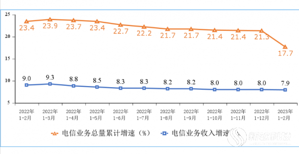 1至2月,电信业务收入累计完成2803亿元,同比增长7.9%。三家基础电信企业积极发展IPTV、互联网数据中心、大数据、云计算、物联网等新兴业务,1至2月共完成业务收入629亿元,同比增长25.7%。