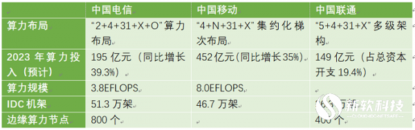 中国电信加快建设以云网融合为核心特征的数字信息基础设施,持续优化“2+4+31+X+O”的算力布局,2023年算力(云资源)预计投入195亿元,增长39.3%,算力总规模达3.8EFLOPS,同比增长81%,IDC机架达到51.3万架,机架利用率超过70%;中国移动优化“4+N+31+X”集约化梯次布局,2023年算力网络投入452亿元,同比增长35%,算力规模达到8.0EFLOPS,净增2.8EFLOPS,对外可用IDC机架达到46.7万架,净增6万架;中国联通完善“5+4+31+X”多级架构,2023年算力投资149亿元,占总资本开支比例达到19.4%,IDC机架规模达到36.3万架。