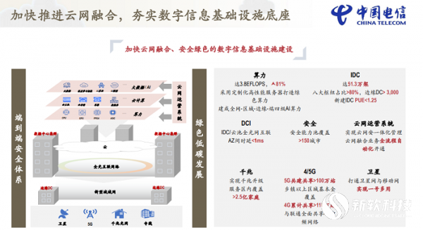 中国电信全面推动“云网数智安”多种数字要素的统筹规划与协同布局,加快推进网络转型升级,加快建设高速泛在、天地一体、云网融合、智能敏捷、绿色低碳、安全可控的智能化综合性数字信息基础设施。