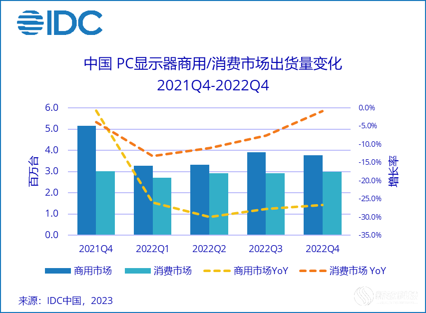 IDC最新发布的《中国PC显示器市场季度跟踪报告》显示,2022年第四季度中国PC 显示器出货量为676万台,同比下降17.1%。2022年全年出货量为2583万台,同比下降20.1%;其中消费市场同比下滑8.3%,商用市场同比下滑27.6%。终端需求疲软,全产业链承压前行。