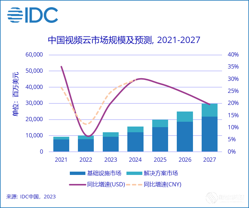 与上期预测相比,IDC根据2022下半年实际情况更新了全年数据,并结合行业最新发展动态、上游预测数据以及汇率变化,调整了市场增长预期及规模。本期调整后,预计2027年中国视频云市场规模将达到300亿美元。