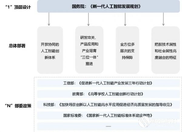十九大以来,国家陆续出台了“1+N”政策体系,为人工智能发展提供政策依据和制度保障。其中,“1”是指2017年国务院发布的《新一代人工智能发展规划》,这是我国在人工智能领域中的首个系统部署的文件,也是面向未来打造我国先发优势的顶层设计文件,将人工智能正式上升为国家战略,提出了面向2030年我国新一代人工智能发展的指导思想、战略目标、重点任务和保障措施。“N”是顶层设计出台之后,部委层面陆续出台的关于人工智能产业的发展规划、行动计划、实施方案等落地政策,其中工信部、科技部发布的政策主要涉及数实融合、场景创新、区域创新等内容,国家标准委、发改委围绕标准体系、伦理规范、基础设施建设等内容开展工作。