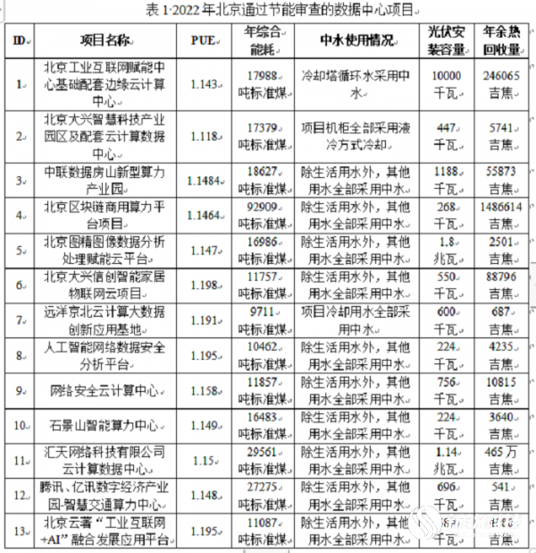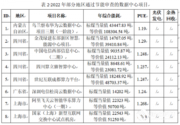 2022年部分地区通过节能审查的数据中心项目如表2所示,参考同期公开可查的上海、广东、四川、内蒙古等地区对于数据中心项目的节能审查,似乎并没有北京这么严格。2022年通过审批的上海阿里飞天云智能华东算力中心(一期)和临港书院数据中心建设项目国家(上海)新型互联网交换中心试点机房项目的PUE基本控制在1.3,粤港澳大湾区华南数谷(一期)项目PUE控制在1.25,而同等条件下,北京地区数据中心PUE则要控制在1.15以下。同时,在公开可查的节能审查内容中,也没有对光伏发电、余热回收、中水使用等提出明确的要求。