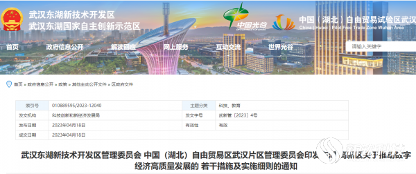武汉东湖高新区发布《关于推动数字经济高质量发展的若干措施及实施细则》