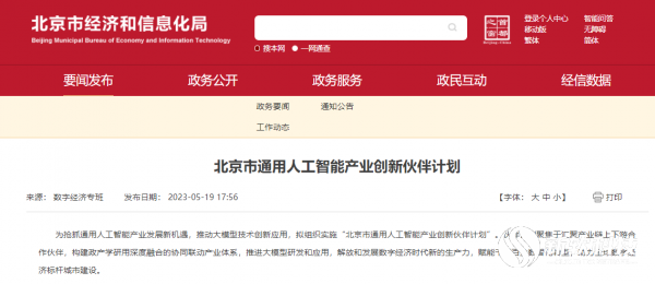 北京市启动“北京市通用人工智能产业创新伙伴计划”