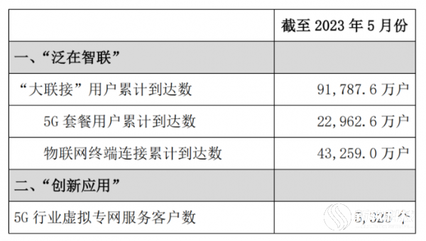 数据显示,截至2023年5月份,“大联接”用户累计到达91,787.6万户,5G套餐用户累计到达22,962.6万户,物联网终端连接累计到达43,259.0万户。