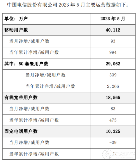 数据显示,5月中国电信移动客户数净增93万户,用户总数达到4.0112亿户;5G套餐用户数净增339万户,累计达到2.9062亿户。