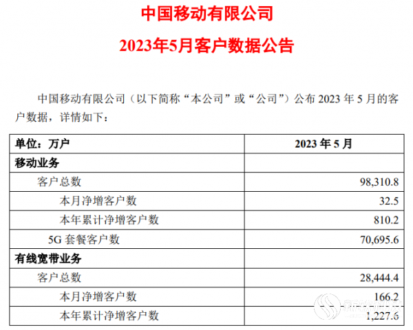 中国移动发布公告表示,5 月移动业务客户总数约 9.83 亿户,5 月净增 32.5 万户;5 月 5G 套餐客户数约 7.07 亿户。