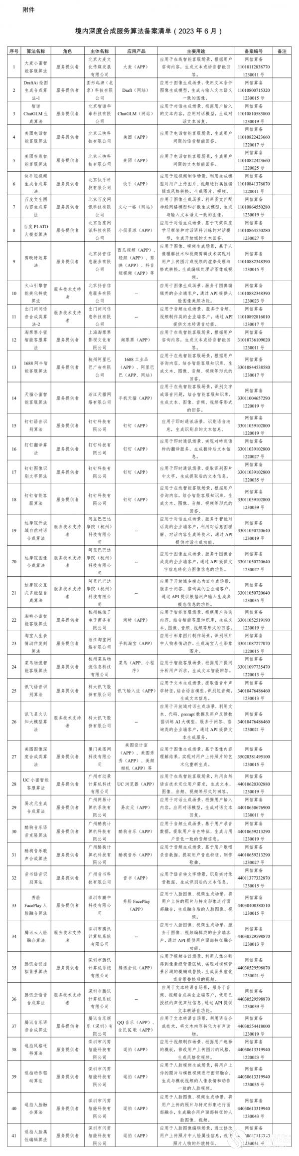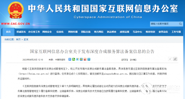 6月20日,国家互联网信息办公室表示,根据《互联网信息服务深度合成管理规定》,现公开发布境内深度合成服务算法备案信息。